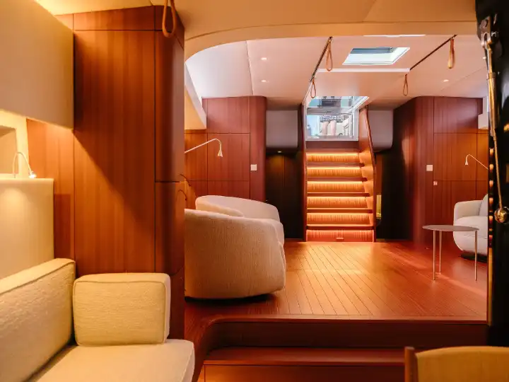 “The aim was to give the yacht a residential feeling rather than a typical yacht or racing boat feeling,” says Thulstrup. “So the first step was looking at how we could lay the space out so that there was a sense of openness.” The initial move was to create an open-plan living area in the centre of the yacht: on walking down the stairs and into the cabin area, you enter a generously proportioned salon-like space rather than being squeezed into a warren of hallways that typically lead to bedrooms.