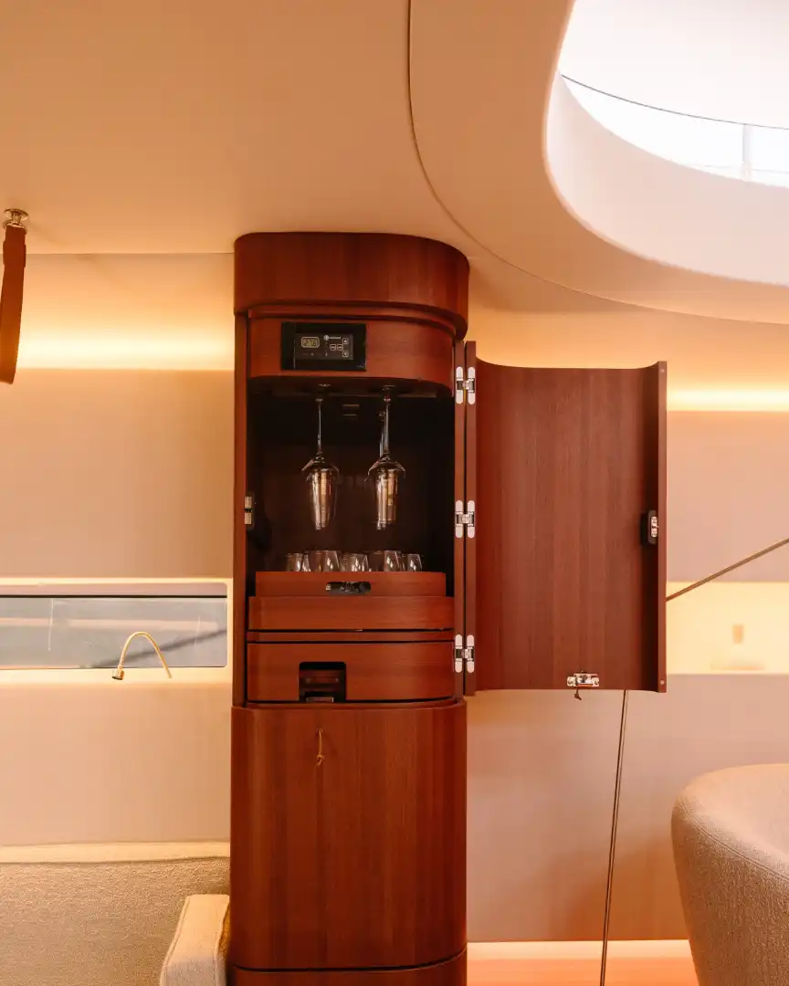 The project wasn’t just about translating Thulstrup’s residential design language into a new environment – the fit-out needed to be engineered for travelling at speed too. “It means that we were always looking for a balance between material weight and strength, and beautiful design,” says Francesca Modica, leader of Y Yacht’s in-house design team. “We are always trying to make everything as light as possible.” Modica holds master’s degrees in architecture and yacht design from Politecnico di Milano and worked closely with Thulstrup on the creation of a fit-out for the Y8 that balanced aesthetics with performance. The duo developed custom cabinets, cupboards and drawers that discreetly lock when closed, so that their contents don’t fall out when jostled by the open sea. “A yacht is a home and it’s a product,” says Modica. “You need to study every detail, like it’s a product you’re developing. But you also need to be able to live in it like a home.”