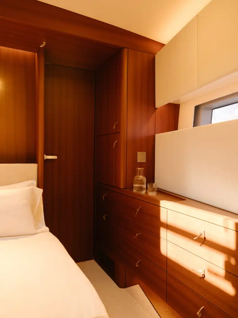 “If the upper deck is all about performance, then the lower deck is all about quietness,” says Thulstrup, adding that the mix of materials was a key consideration too. Matt-finishes typically associated with domestic environments were used to complete the space, with cedar-veneer on the floor and walls, and solid mahogany on the steps and handrails. “When you’re up on the deck, everything shines and shimmers, reflecting the water, which means that, visually, there’s always something going on,” adds Thulstrup.