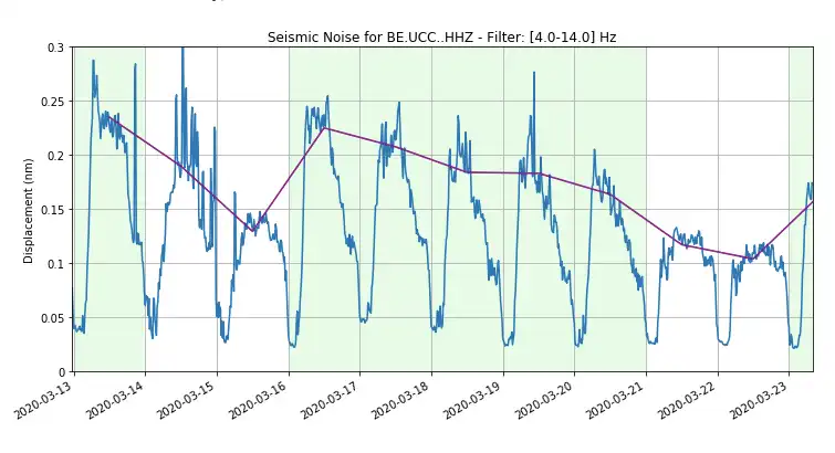 Seismologist Thomas Lecocq says that levels of seismic noise have been about 30% to 50% lower since mid-March. He says the current levels are about the same as the country would have on Christmas. Mr. Lecocq created the graph above, showing the drop.