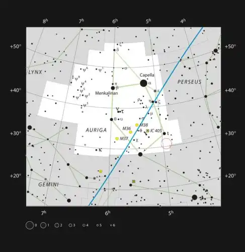 This map shows where AB Aurigae is (red circle). Other well-known stars and groups of stars are included to show where AB Aurigae can be found in the sky.