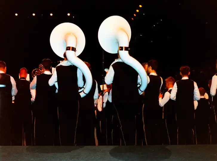 Tonight’s concert, introduced to the repertoire just over a decade ago, is an acquiescence to the growing popularity of brass bands. Under the bright lights of the indoor basketball arena, there is a mishmash of outfits, including a group of young children dressed in black, complete with yellow rain boots, who run onto the stage as bands play behind them. Primed, prepped and beaming, there are barefoot girls in flower headdresses and others in red tartan who are shaking pom-poms, making it feel a little like a US beauty pageant.