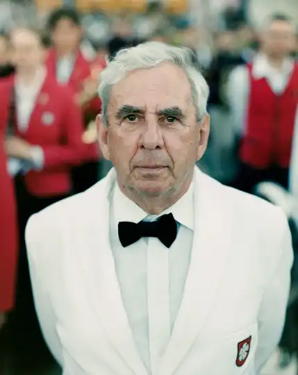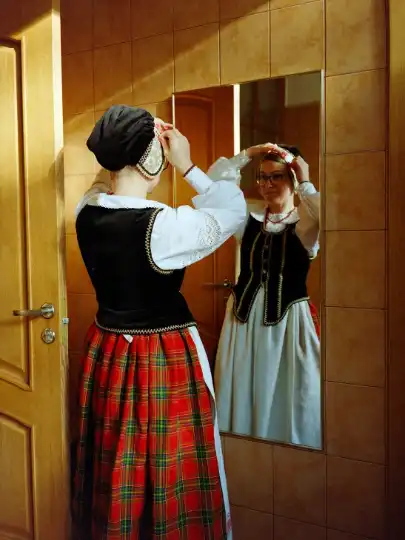 To arrive at the stadium, the performers had assembled in Vilnius’s Cathedral Square and walked for several kilometres in a giant procession – often accompanied by more brass bands. They were waved on by people lining the streets, some of whom were perched on grass embankments to get a better view. Inside the park just before the clearing where the stadium stands, Micheline Beniusis is sitting on a bench, wearing a lilac dress, with a crown of flowers in her hair. Born in Montréal to Lithuanian parents, she is in her late eighties, which doesn’t seem to get in the way of her flying over to join what is a physically demanding event alongside three grandchildren and two nephews.