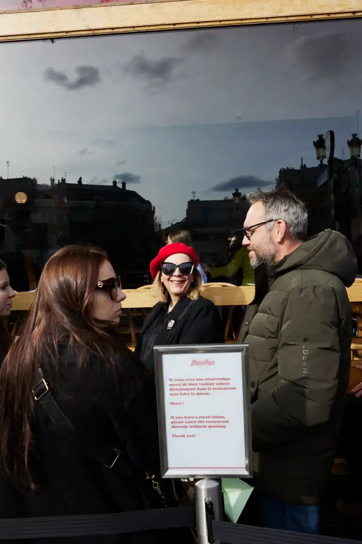 Waiters in white shirts and black waistcoats serve dishes ranging fromsoupe à l’oignonandoeuf mayonnaiseto the French-cuisine cornerstone steak frites, all at alluring prices. Many of the people queueing outside note that this is a considerable part of the place’s appeal. “I’m queueing today with my flatmates from back home in Germany,” says Stephanie Schachel, a student living in Paris while spending a semester at Sciences Po. “I know this place: it’s cheap but good.” Another queuer, Nicolas Lopez, is also an international transplant to the city and showing visitors around. “I wanted to introduce my family to the concept of abouillon[a restaurant that serves traditional French cuisine],” he tells Monocle. “I particularly like thesaucisse-purée[sausage served with mash]. It’s French and inexpensive.”