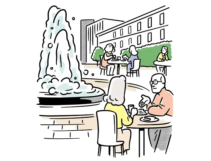 The services on offer should be enhanced by the surrounding public space. In a mixed-use development, make sure restaurants front onto plazas that diners can spill onto when the weather is fine and that there are benches for workers to stop for coffee. MVRDV’s Atelier Gardens in Berlin blends office space with hospitality offerings in a prime parkland setting.