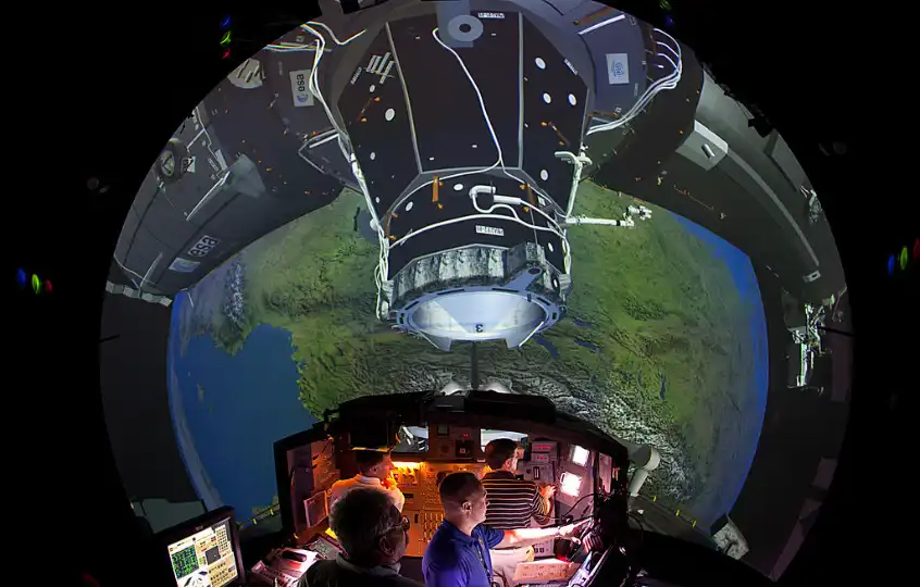 The people who are chosen will also need to have near-perfect eyesight and be in good shape. They must be good at working with other people. Above, astronauts practice docking with the International Space Station in a simulator.