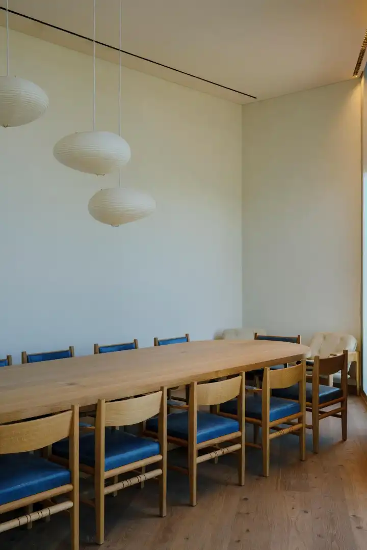 Private dining room featuring furniture by Fyrn and lighting by Isamu Noguchi